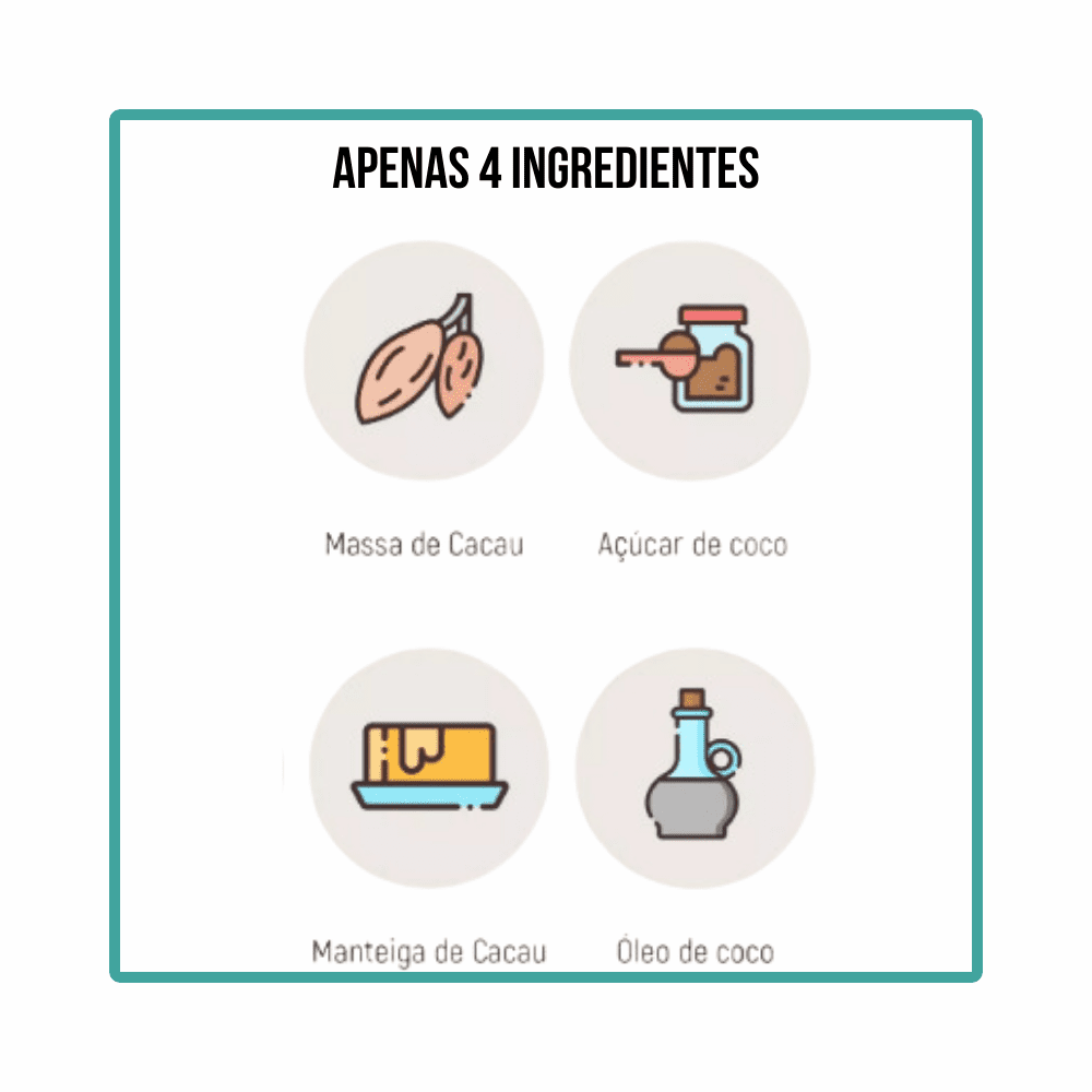 Sem açúcar, adoçantes, gorduras ou corantes, o chocolate Only 4 é feito com apenas quatro ingredientes saudáveis: Massa de cacau, açúcar de coco, óleo de coco, manteiga de cacau.